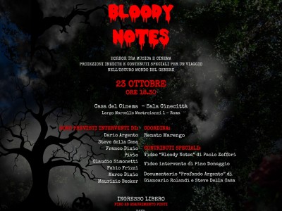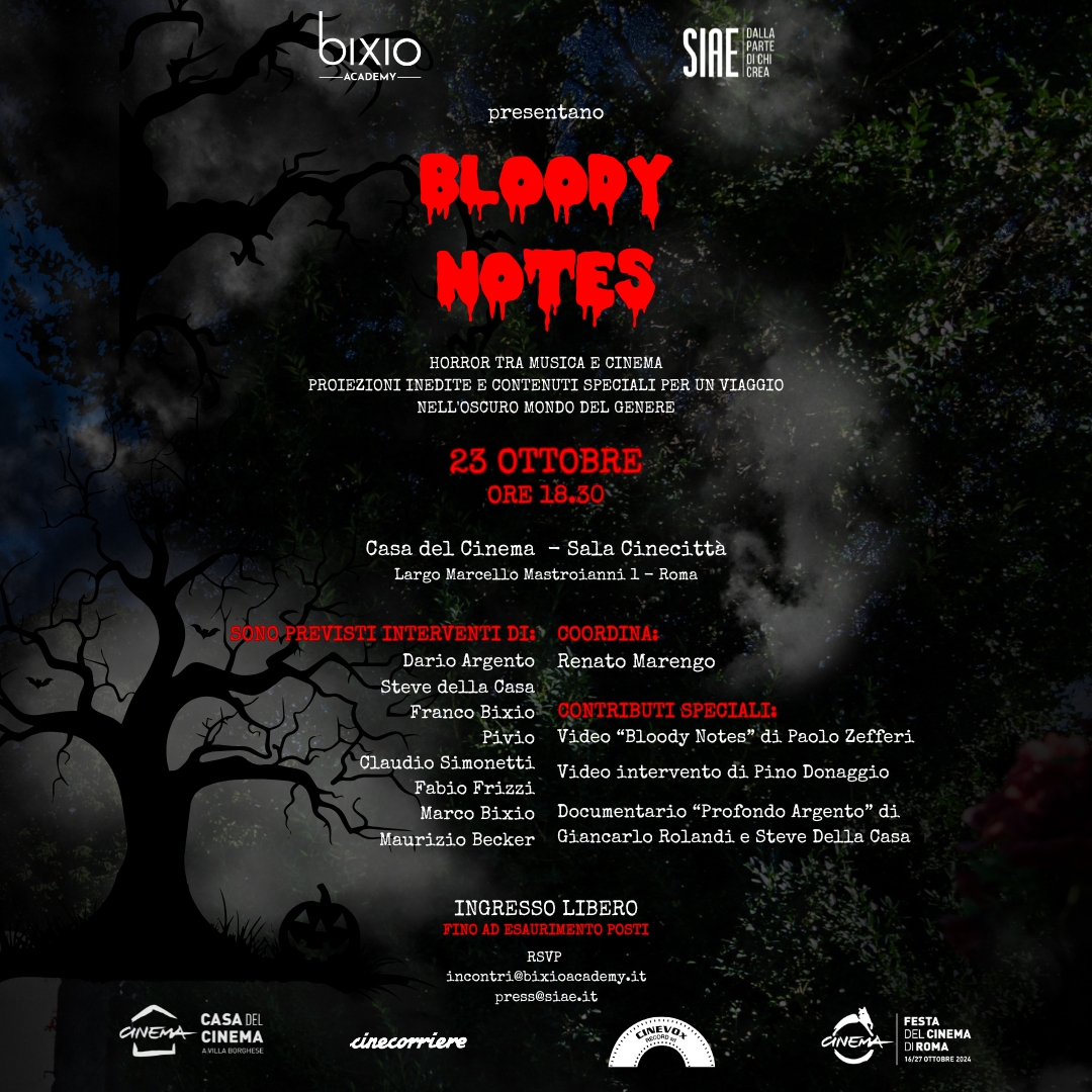 Mercoledì 23 Ottobre 2024, SIAE e Bixio Academy organizzano “Bloody Notes”, un incontro che celebra le colonne sonore nel cinema del brivido, alla presenza di alcuni tra i più importanti autori di colonne sonore, conosciuti e apprezzati in tutto il mondo. Sul palco della Casa del Cinema, Franco Bixio, presidente del più antico gruppo editoriale italiano legato alla produzione di colonne sonore, insieme a maestri di musica come Claudio Simonetti, Fabio Frizzi, Pivio, e al critico musicale Maurizio Becker converseranno sul passato, presente e futuro delle colonne sonore legate al “cinema del brivido” e non solo. Interverrà in video da Venezia per un saluto anche Pino Donaggio. L’incontro sarà coordinato da Renato Marengo. “Bloody Notes” sarà aperto da un cortometraggio di Paolo Zefferi che racconta il legame che da sessant’anni unisce il cinema horror con il Gruppo Editoriale Bixio. Per l’occasione sarà anche presentata da Marco Bixio l’ultima produzione della Cinevox: la stampa della colonna sonora dei Goblin del cult movie L’altro Inferno di Bruno Mattei, illustrata dagli artworks di Fernando Proietti, docente della Scuola Romana dei Fumetti. In chiusura, si terrà la proiezione di un estratto del film documentario Profondo Argento di Giancarlo Rolandi e Steve Della Casa dedicato al grande Dario Argento, nume tutelare di tutto l’evento.