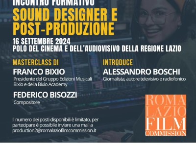 Grande successo per l’incontro del 16 settembre presso il Polo del Cinema e dell’Audiovisivo della Regione Lazio! Un evento dedicato alla professione del sound designer e alla magia della post-produzione, organizzato da Roma Lazio Film Commission.  Protagonisti dell’incontro sono stati Franco Bixio, Presidente del Gruppo Edizioni Musicali Bixio e Bixio Academy, insieme al compositore Federico Bisozzi. Moderato dal giornalista e autore radiotelevisivo Alessandro Boschi. Un’occasione unica di incontro per gli addetti ai lavori e per chi si affaccia a questo mestiere.